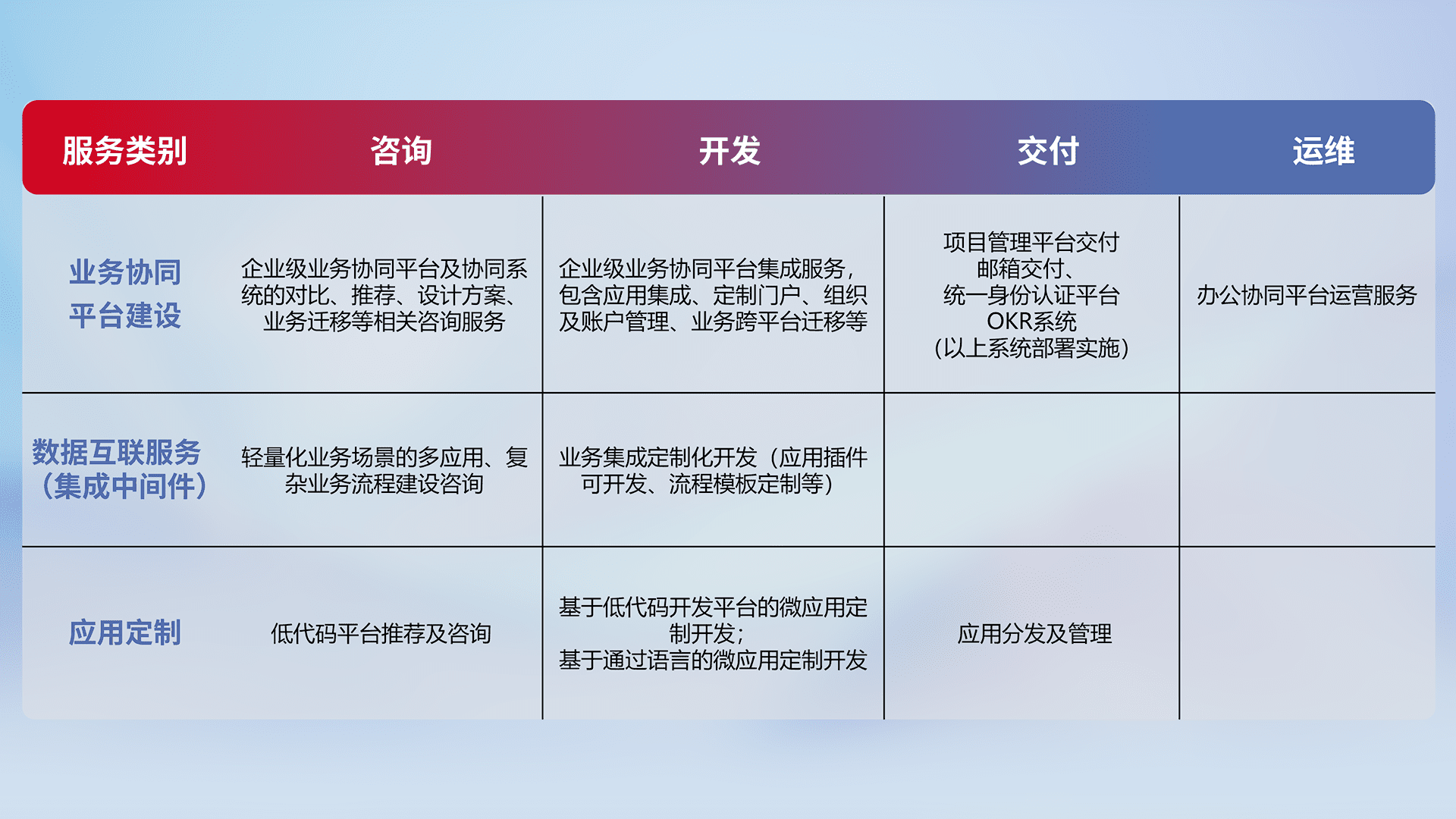 针对钉钉、、企微、、IDaas等平台级产品提供产品的规划、、、、方案、、、、交付、、、、定制化开发等服务,,实现如统一协同办公、、智能客户服务、、、混合会议管理、、、、智能数据查询、、、等业务场景,,,实现数字化转型。。。